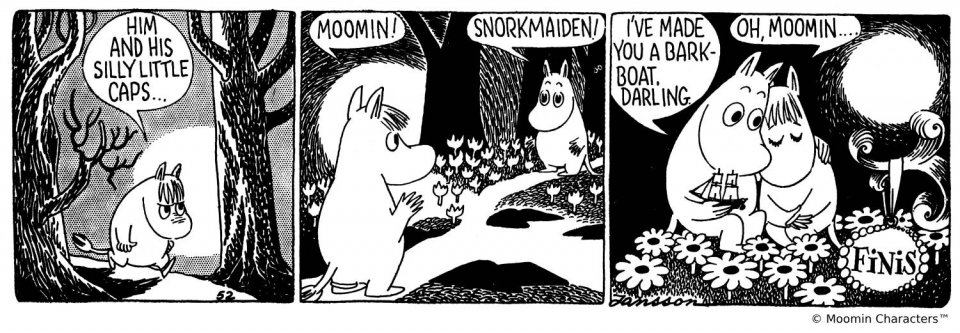 Slotte combined the illustrations from Tove Jansson’s various Moomin comic stories to show their affectionate relationship as playmates and sweethearts. Even though the two sometimes have crushes on others, their adventures always have a happy ending. The humming and hawing nature of their relationship can only mean one thing: true love!