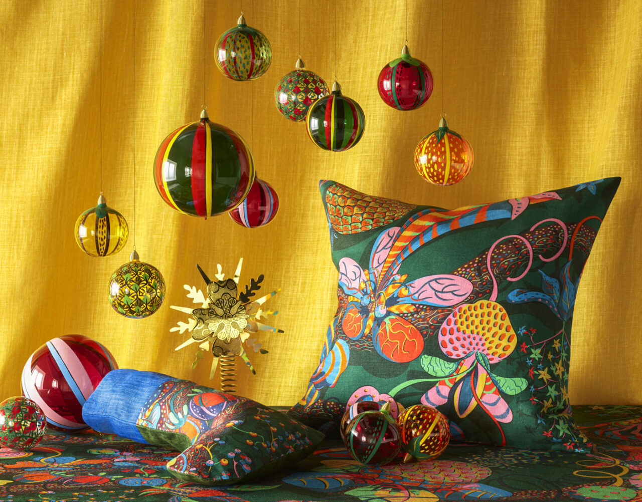 Each ornament is considered through a design lens that balances contrast, light with shadow, and simplicity with intricate detail. Together, they offer a contemporary interpretation of Frank’s visual language, transforming motifs from his Poison textile into sculptural objects for the home.