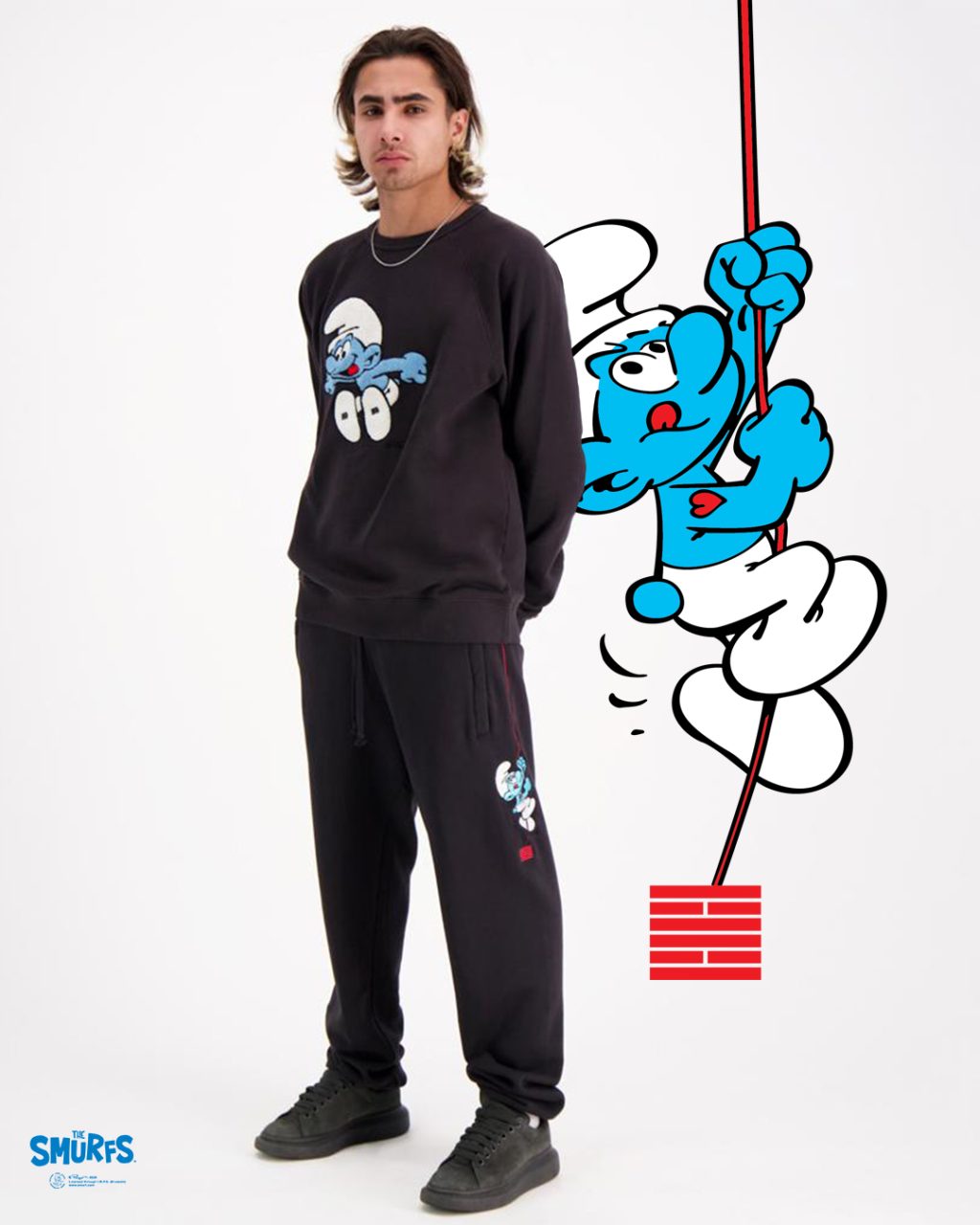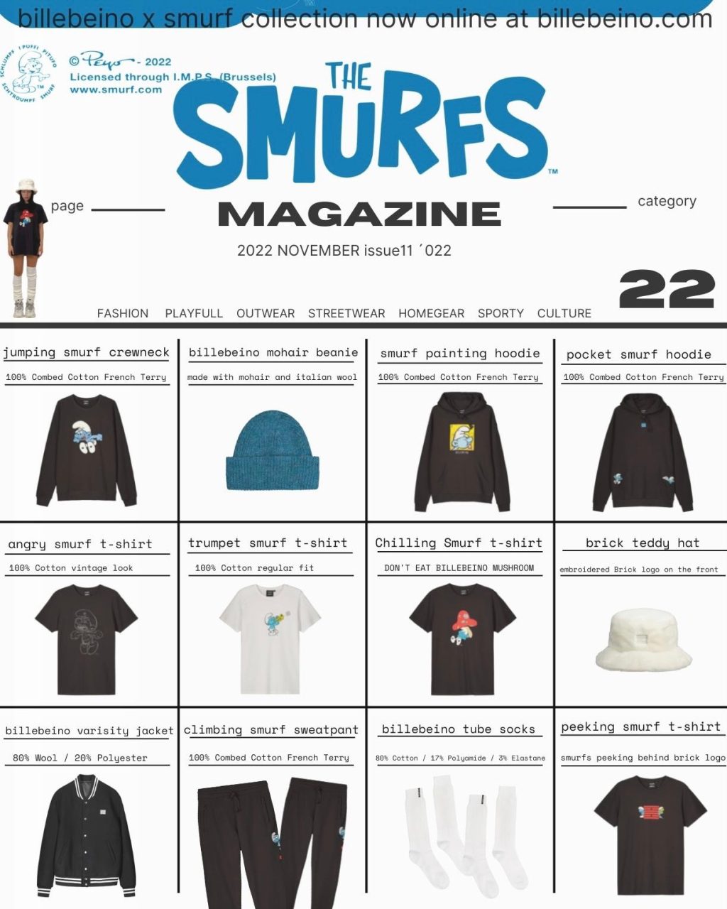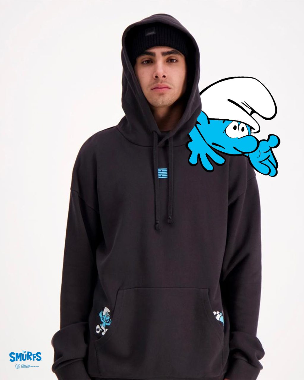 The collection consists of accessories, hoodies, sweatshirts and t-shirts in black and white with the colorful blue Smurfs in playful artworks. Billebeino says about their collection: