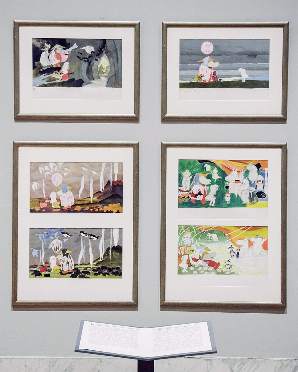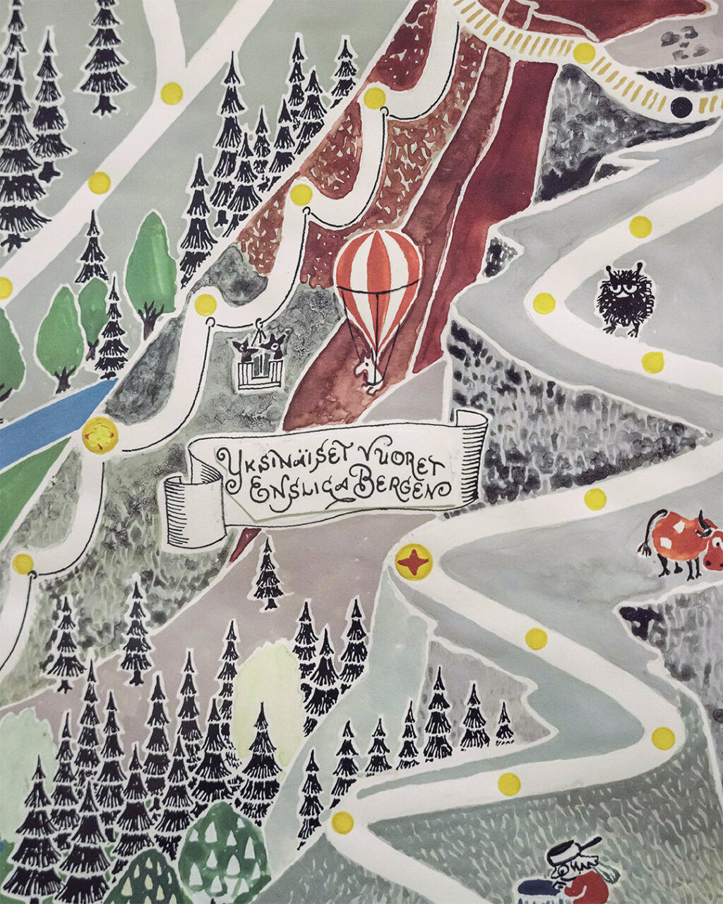 The exhibition includes more than 300 works in the form of sketches, finished illustrations, three-dimensional objects, such as early Moomin figures, and paper sculptures. It emphasises the interplay between image and word, and viewers are invited to reflect on questions such as: How is a character created? How are places, events and moods depicted in an image? What role do colours, lines and shapes play in the exhibited works?