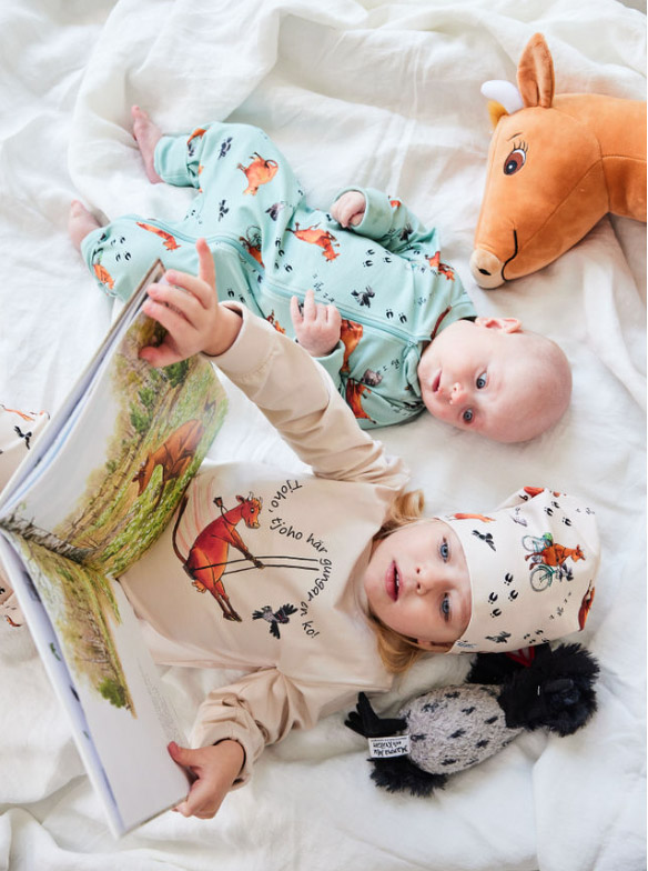 The soft, pastel colours are a great complement to the beautiful and detailed illustrations of Mamma Moo and Crow by Sven Nordqvist. Every piece in the collection is made of organic cotton.