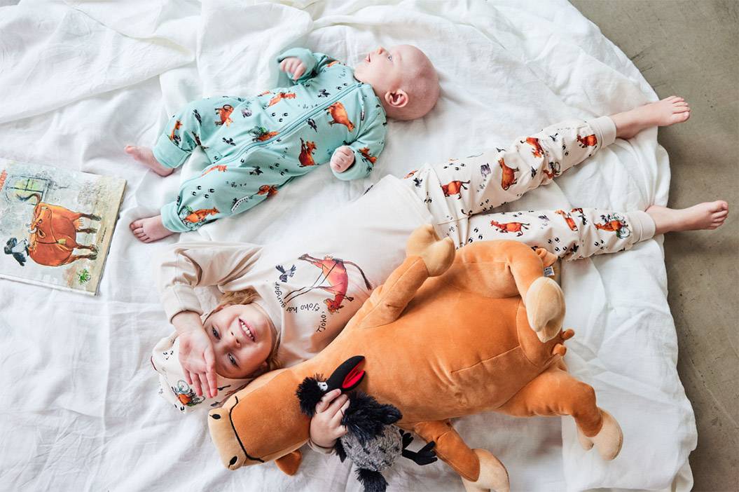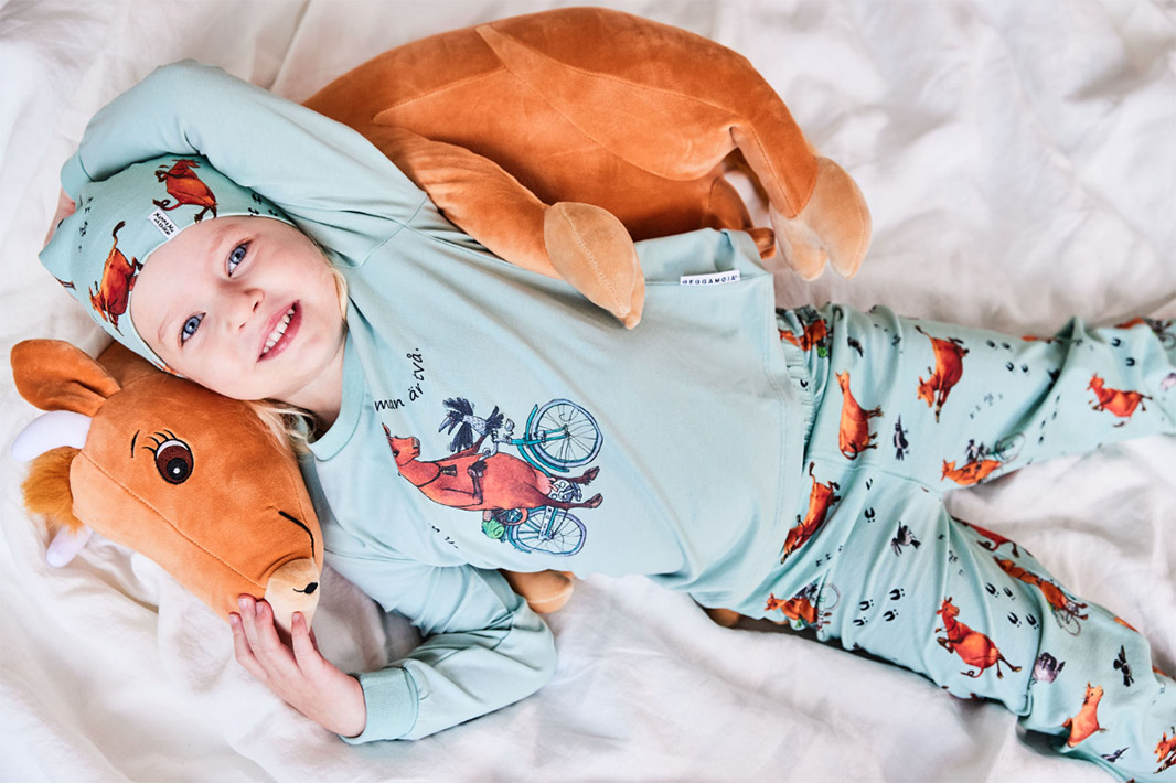 Twirly dresses, several different cozy pajamas designs, leggings, and hats. All children can now get some comfortable, new clothing and get to wear their favorite cow and crow. Geggamoja says that the source of inspiration for the collection is the humor, creativity and quirks of both Mamma Moo and Crow.