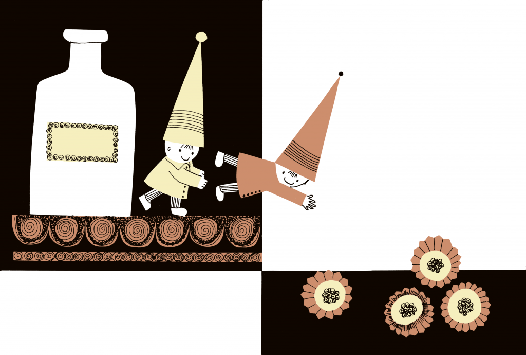 Another resent reissue of Tanninen’s works is the new translation of the tale of Button and Popper by Thames & Hudson, published in 2019. This charming and quirky 20th-century children’s classic originally published in Finnish as ‘Nappi ja Neppari’ in 1964 tells the story of twin pixie brothers who find their family a new home. Kirkus Reviews complemented the reissue as a “visual delight” that “possesses retro charm” and “illlustrated in saturated shades of yellow, orange, and black with simple geometric shapes and line designs reminiscent of Marimekko textiles”.