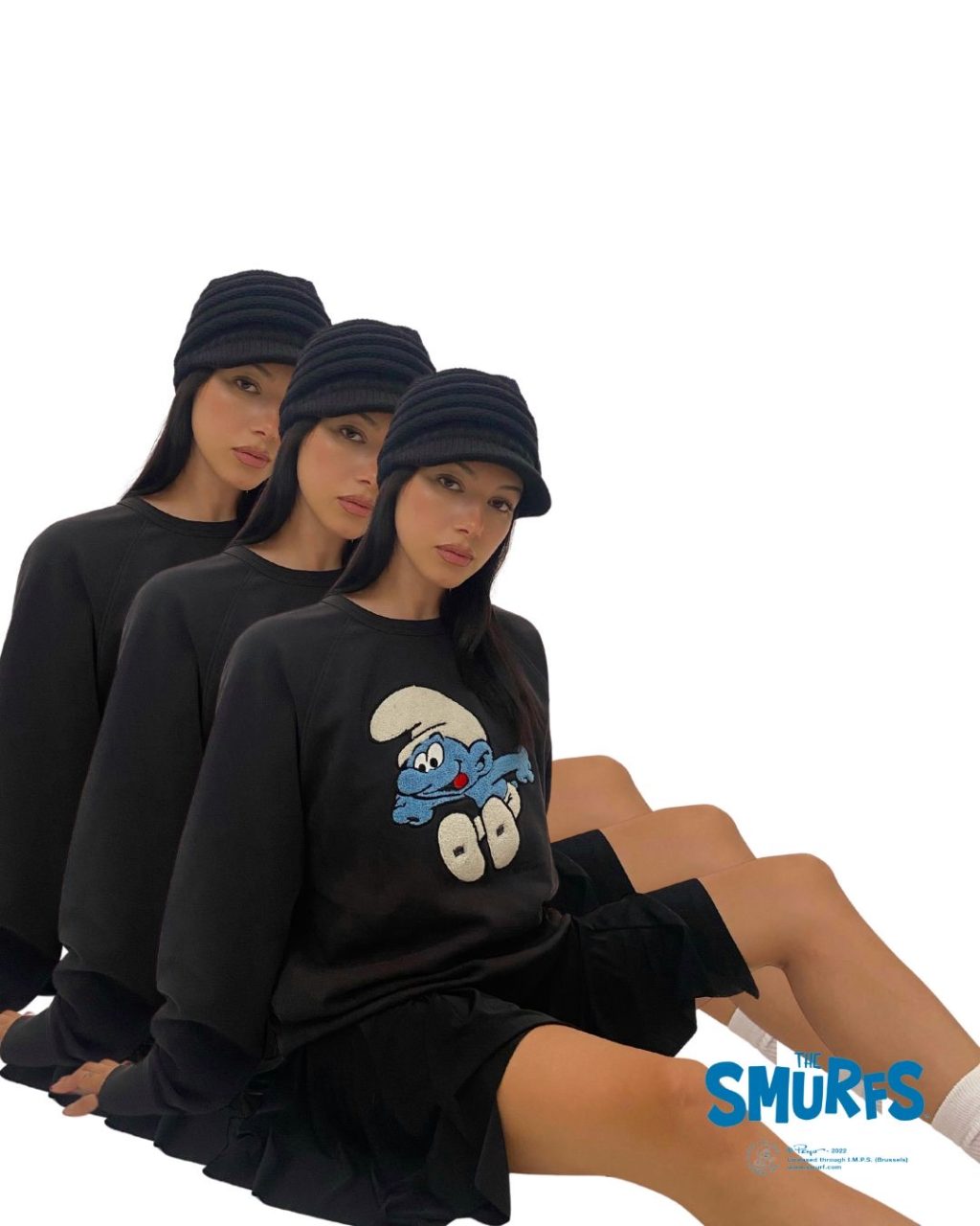 The collection consists of accessories, hoodies, sweatshirts and t-shirts in black and white with the colorful blue Smurfs in playful artworks. Billebeino says about their collection: