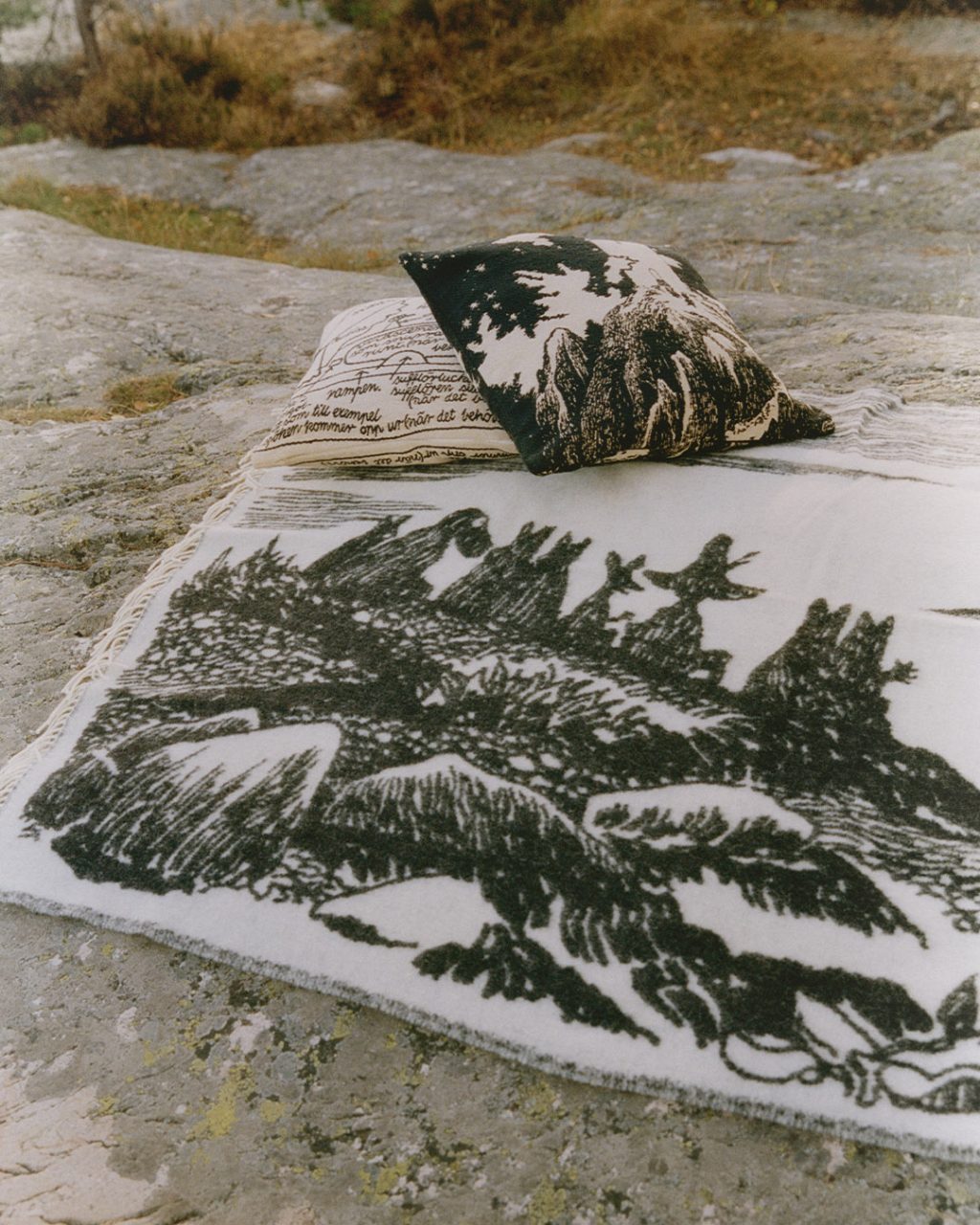 Key pieces for women included a set of dress, blouse and trousers with all-over prints of evocative landscapes in black and white. The children’s collection featured a series of motifs from the Moomin world on sweatshirts, t-shirts, pants and a dress. For the home, black-and-white illustrations cushion covers, and a woven wool blanket produced by the Swedish woolen mill Klippan.