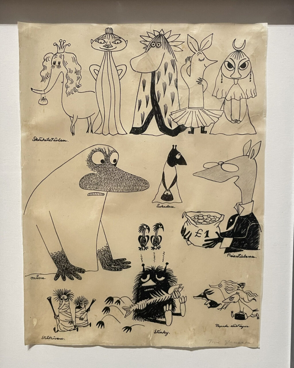 The exhibition includes more than 300 works in the form of sketches, finished illustrations, three-dimensional objects, such as early Moomin figures, and paper sculptures. It emphasises the interplay between image and word, and viewers are invited to reflect on questions such as: How is a character created? How are places, events and moods depicted in an image? What role do colours, lines and shapes play in the exhibited works?